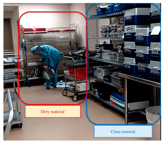 We also observed cross-traffic between storage areas for instrumentation waiting to be sterilized, dirty trays, and instrumentation already sterilized. Part of this crossing between dirty and clean instruments can be observed in