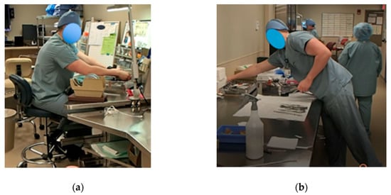 Figure 17 shows WST1 and WST2 before the second PDCA cycle. From the picture, two technicians doing the same task can be compared. One is comfortable sitting with all the disposable items organized within reach (WST1), and the other one has no chair and has to adopt an uncomfortable position (reaching and bending) to obtain some of the needed instruments (WST2) from a tray which is not organized or labeled.