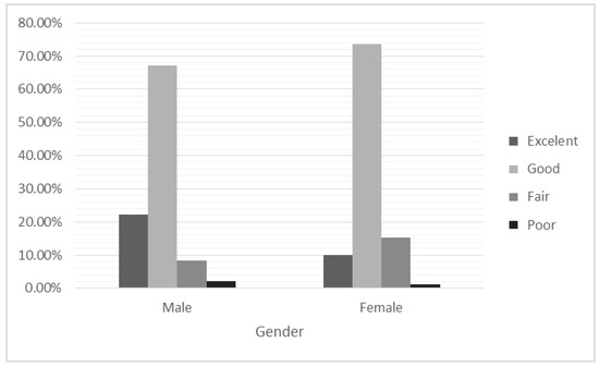 Adjusted standardized residuals showed that a significantly greater proportion of men perceived their health as excellent when compared with women (z = 4.7), whilst women perceived their health as good or fair to a greater extent than men, although the difference was smaller (z = 1.9 and z = 2.6, respectively). In this regard, a higher proportion of men responded as having poor health when compared with women (z = 1.3), with this difference being of a lower magnitude. These results can be seen in Figure 1, where more men rate themselves as having excellent/good health while women tend to indicate good/passable health.