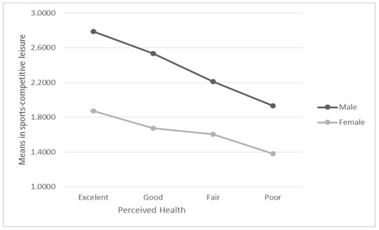 However, no statistically significant interaction was found between perception of health and gender for sports–competitive leisure (F (3,876) = 1.271; p = 0.283).