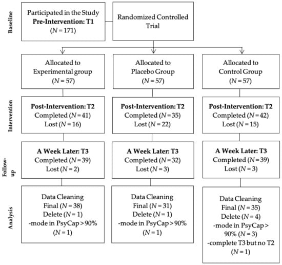 Both the recruitment and the intervention in this study were conducted through WeChat, the most popular online social and work connection application in mainland China. The study was open to all who met the following inclusion criteria: 20–60 years old; full-time employees in mainland China; working for five consecutive workdays every week; and ability to access WeChat on a daily basis. Participants were excluded from the study if they had a psychology degree, just in case they were familiar with the procedures of psychology interventions and responded to the surveys in accordance with the purpose of the intervention. We utilized a convenience sampling method, posting the recruitment advertisement on researchers’ WeChat. Due to the snowball effect, we recruited 171 participants at time 1 (T1). Due to dropout, 118 participants completed the questionnaire at time 2 (T2), and 110 participants finished the questionnaire at time 3 (T3). After data cleaning, the final sample consisted of 104 participants (Figure 1). The rate of valid data was 60.82%.