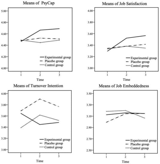 Moreover, based on the conservation of resources (COR) theory [,], we examined not only the effectiveness of this PsyCap intervention but also its influence on other work-related attitudes: job satisfaction, turnover intention, and job embeddedness. Consistent with both our hypothesis and the results of other studies [,,], we found that our intervention based on the PCI model significantly enhanced PsyCap. In addition, we found that our intervention significantly improved the job satisfaction level in the experimental group over time, despite the group difference at the three time points not being significant. Moreover, we found that our intervention significantly reduced the turnover intention at time 2, whereas the intervention effect at time 3 was not significant. Specifically, the group difference was significant at time 2, despite the fact that the time difference was not significant. Even though the effect size of PsyCap intervention’s influence on job satisfaction and turnover intention was not strong, it still showed a positive tendency in the experimental group, which is worth further exploration.