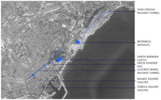 Image of the different enclaves chosen in the study of the city of Alicante: the shelters of Plaza Balmis and Plaza Seneca, the Castle of Santa Barbara, the Powder Magazine of the Ereta, the deposits of the British and the two tunnels of the TRAM of Alicante (Source Google Maps. Own elaboration).