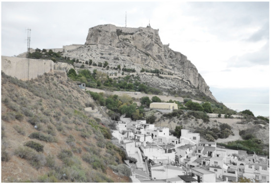 The castle is located at the top of Benacantil Mount, a rocky mountain; from the viewpoint of the beach, it has an appearance that is called “the face of the Moor” because of its morphology (Figure 5). This mountain has been the object of archaeological work where remains have been found from the Bronze Age, the Iberians and the Romans, which shows the importance that it has always had for the city [26].