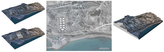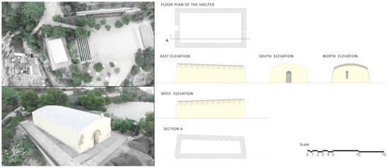 The shelter is composed of a single rectangular body volume of 51 by 12 m, in addition to the two lateral and symmetrical entrances on the 9-m bottoms (Figure 2). The project was conducted while accounting for the large size of the piece, and therefore, the foundation slab is composed of a variable concrete frame of between 60 and 180 cm [31].