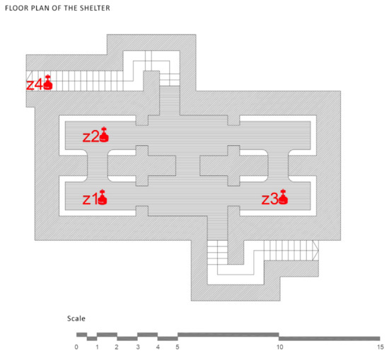 The refuge of Plaza Balmis is of the cellular type, according to the characteristics of the municipal architect of the time, and the body of the refuge is buried two meters above the level of the square. The volumetric layout of the refuge is composed of six rectangular cells with an approximate surface area of 7.5 m2, each one with a height of between 1.81 m and 2.33 m. The six rooms are connected by steps of approximately 1 m. The whole of the refuge has approximately 50 m2 without counting the accesses (Figure 4).