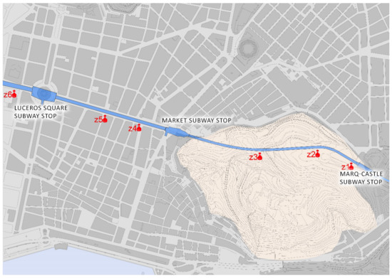 The tunnel has an average depth of 15 m and connects by a 1700 m conduit to the existing points of the TRAM stop at the foot of the castle (Marq-Castillo), Mercado and Luceros, with the future Renfe stop that is still being excavated although it is not yet connected to the tracks. The survey points correspond to the following areas inside the tunnel, as shown in Figure 14.