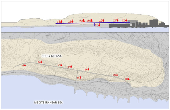 Top image of the tunnel elevation with the arrangement of the measuring elements. The Serra Grossa and the Albufera can be seen. Image below the tunnel floor with the disposition of the measuring elements.