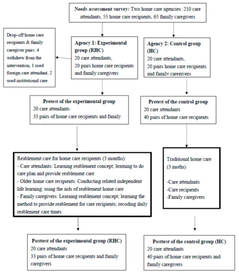 Two HC agencies participated in this survey. One home care agency was recruited as the experimental group and implemented the RHC program; the other agency was invited as the control group and implemented traditional HC service. The inclusion criteria for the participants in the two groups were older adults aged 65 years and above with a disability who were able to communicate, intact cognitive function (records from the agencies), and willing to participate in the program. The existing home care recipients and their family caregivers in these two agencies were approached and invited to participate in this study. When they understood the whole program and agreed to participate in the program, consent was provided, and the process was assessed every month during the study. The RHC group consisted of 33 pairs of care recipients and family caregivers with 20 care attendants, whereas the traditional HC (control) group consisted of 40 pairs of care recipients and family caregivers with 20 care attendants (see Figure 1). The intervention was conducted for 3 months.