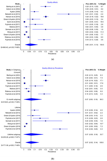 Eight studies evaluated 12-month prevalence, and eight lifetime prevalence. There was no difference for 12-month (prevalence = 7%, 95% CI: 0.00–0.16) or lifetime prevalence (prevalence = 7%, 95% CI: 0.00–0.18) for sexual violence (Figure 2b). The heterogeneity of the 12-month prevalence was 99%, while in the lifetime subgroup it was 97%.