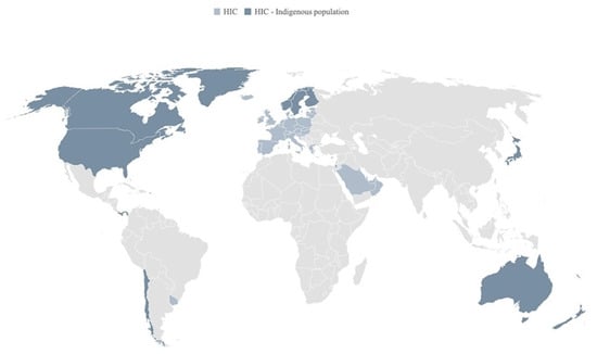 This review draws on the breadth of published scholarly knowledge that exists on the retail food sector as it relates to Indigenous Peoples in HICs (Figure 1). A universal definition of “Indigenous” people has not been adopted by any UN-system body. Instead, the system has developed a contemporary understanding of this term based on several factors such as self-identification, historical continuity with pre-colonial and/or pre-settler societies, distinct social, economic or political systems, languages, cultures and beliefs [3]. In some countries, there may be preference for other terms including tribes, first peoples/nations, etc. Consistent with the United Nations recommendation of identifying, rather than defining, Indigenous Peoples [3], we systematically searched each HIC to identify Indigenous Peoples, following the approach described by Cisneros Montemayor et al. 2016 [46] (see Supplementary Material Figure S1). The objective was to define the scope of the review and to identify population-specific terms for the literature search. First, we conducted systematic searches by country in 2 major international databases: The World Directory of Minorities and Indigenous Peoples [47] and the eHRAF World Cultures database [48]. Populations of interest included both state-recognized and unrecognized ethnic/cultural groups that are the original or earliest known inhabitants of an area, and/or populations that maintain historical continuity with precolonial and/or pre-settler societies [3]. Database searches were complemented by referring to other key documents on Indigenous Peoples’ health—notably, the Lancet–Lowitja Institute Global Collaboration on Indigenous and tribal peoples’ health [49]. Ultimately 19 HICs with Indigenous populations across 5 global regions, were retained for this review (see Supplementary Material Table S1).