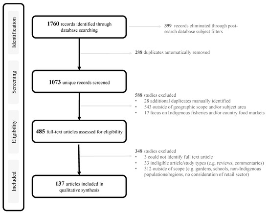 The search was restricted to English language journal articles published over the last thirty years (1990–2020, inclusively)—a timeframe determined through an initial search with no date restrictions. To be eligible for inclusion, original peer-reviewed articles must have satisfied the geographic (HIC), populational (Indigenous population), and thematic focus (retail sector), as defined by the inclusion criteria (see Supplementary Material Table S5). Reviews, commentaries, study protocols, and grey literature were excluded. Articles focusing on other community/neighborhood food environment settings (e.g., schools) were excluded. Likewise, studies focusing exclusively on traditional foods and harvesting were excluded. Assessments of diet, food security, health, and psychosocial (e.g., knowledge and attitudes) factors, as well as community social, economic, and cultural conditions were excluded unless they incorporated a direct link to the retail food sector within study results.