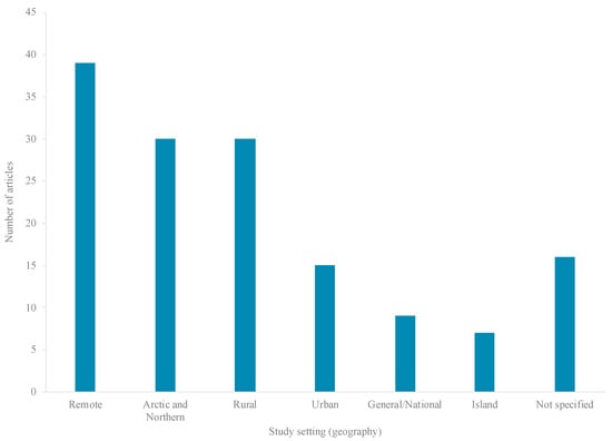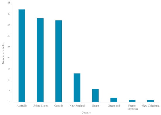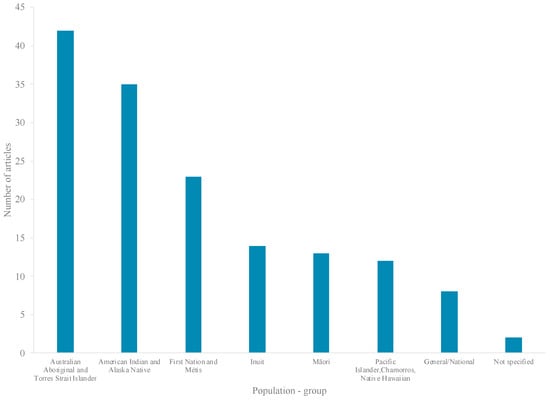 Published literature was available from less than half (8 countries) of the 19 HICs eligible for inclusion in the review (Figure 4), 95% of studies conducted in four countries: Australia (31%; 42 articles), the United States (US) (28%; 38 articles), Canada (27%; 37 articles), and Aotearoa/New Zealand (NZ) (9%; 13 articles) (Figure 4). Literature pertained to five major Indigenous groups, including: Aboriginal and Torres Strait Islanders (42 articles), American Indians (AIs) (35 articles), First Nations (FNs) (20 articles), and Inuit (14 articles) (Figure 5). Most research (99 articles) was set in rural, remote, and/or northern/Arctic regions and involved distinct Indigenous communities or populations (Figure 4 and Figure 6). Few studies were conducted in urban areas (15 articles) and/or involved multiethnic populations (Figure 4 and Figure 6). Importantly, the definitions and use of the term’s “rurality”, “remoteness”, and “northern”, can vary considerably across studies, countries and contexts, based on technical and social factors. Nevertheless, remoteness is generally understood in terms of geography and access to health, education, energy supply, and other public and private services, each of which are often most highly concentrated in major contemporary population centers.