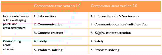 Figure 1) were made to the descriptors established in version 1.0 as well as to the competencies assigned to each of the five areas. Below is a figure comparing the areas established in both versions.