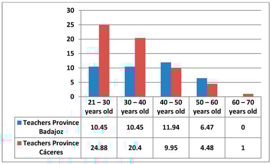 In the case of the province that has obtained the most participants, it has been the province of Cáceres, with almost 20% difference. If we look at these data compared by sex, we find that the majority of participants in the questionnaire have been women between 21–30 years old and men between 21–40 years old, both as we have already mentioned, work in centers in the province of Cáceres.