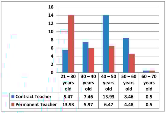 About the types of positions occupied by the teachers surveyed, we found differences between contract teacher position and permanent teacher positions. When comparing the types of positions held by teachers, we found that there are more female contract teacher positions than male contract teacher position aged 21–30 and that there is almost twice as much difference between male contract teacher position and female contract teacher position in the 30–50 age range.