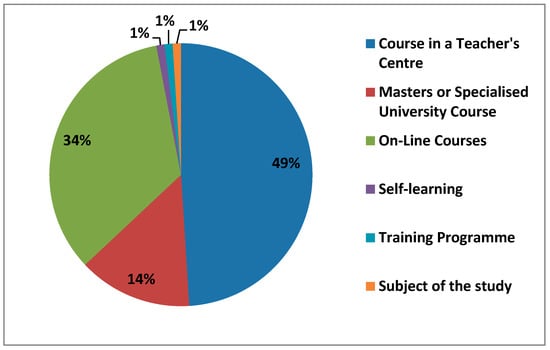 It can be seen how teachers take advantage of complementary ICT formation offered by Teachers’ Centres, as these are specific courses for teachers. They are followed by online courses on distance learning platforms as the second most popular option. We have also observed to a lesser extent, how the self-learning method has emerged.