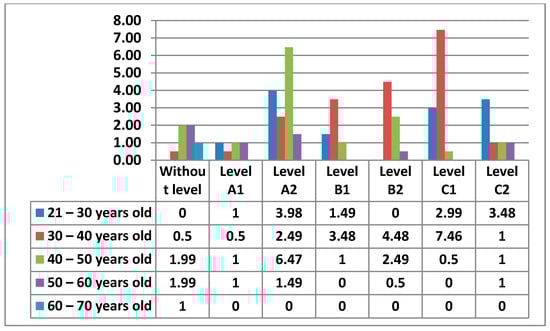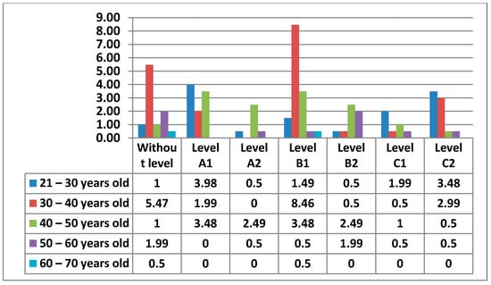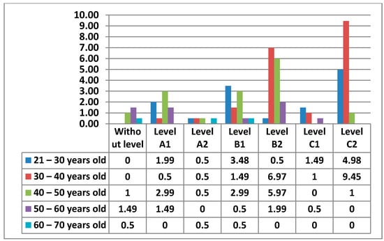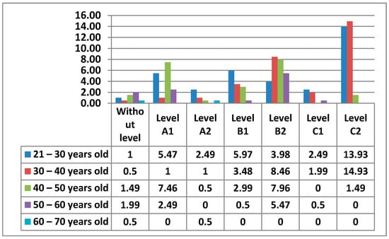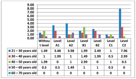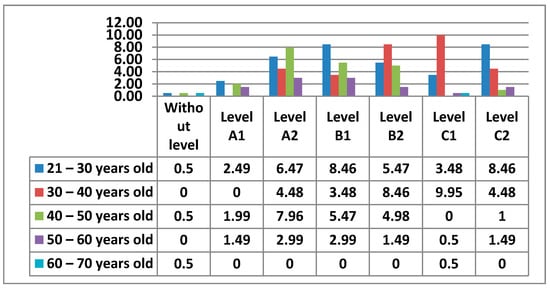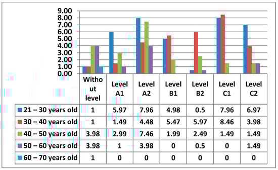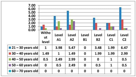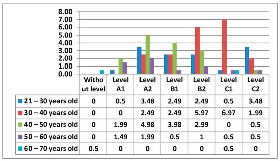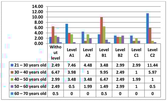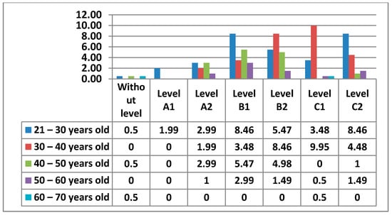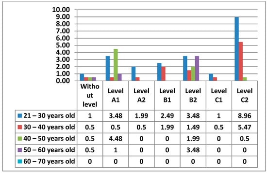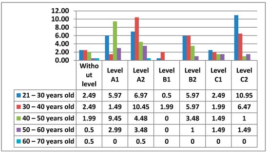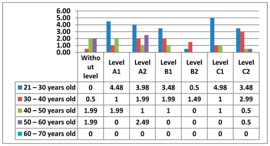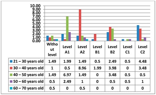 In Area 3—content creation, it is identified whether the teachers know how to use different computer programs, on-line programs, or applications, whether they are free or private software, which allows the creation, manipulation, and distribution of information. As in Area 2—communication, in Area 3—content creation, there is a higher percentage of teachers who do not have any level in this area, as it is a question of using tools to create different types of content and even advanced tools for the manipulation or creation of teaching content. There are teachers without any level in all age groups, however, we observe that teachers between 21–40 years old have a lower percentage than those between 40–60 years old. This means although it is not such a high percentage, that despite being born into the digital age, there is still a lack of digital literacy even among the youngest teachers. The percentages of levels are more equal than in previous areas. In Area 3—content creation, the 30–40 and 21–30-year age groups with Level C1 and the 21–30 year age group with Level A2 stand out. The male and female teachers who do not have any level are practically identical. The difference exists between the 21–30 age group, where men have no teacher with any level and women have one, and the 60–70 age group, where the opposite is true. Likewise, while the highest percentage of men in Area 3—content creation is in the 30–40 age group with Level C1, women share the highest percentage between two levels, Level C1 and Level A1, both with the same age group of 21–30 years old.