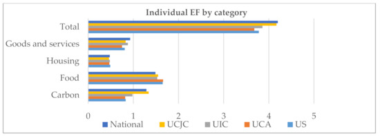 Table 4 shows the results obtained for EF expressed in global hectares (gha) and disaggregated by category: Food Footprint (FF), Goods and Services Footprint (GSF), Carbon Footprint (CF) and Housing Footprint (HF). The table also shows the average national values provided by the tool.