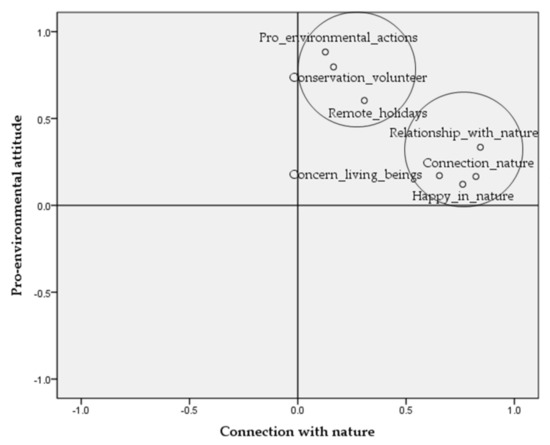 Of the seven variables analysed, four (I feel connected to nature, I feel happy in nature, my relationship with nature is important to me and I feel concerned about living beings and the Earth) were grouped into one factor (with a Cronbach’s alpha of 0.792), while the remaining three (I would choose a wild, remote place for my holidays, I take part in pro-environmental actions, I take part in conservation activities) were grouped into another with a Cronbach’s alpha of 0.634 (Table 8).