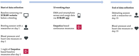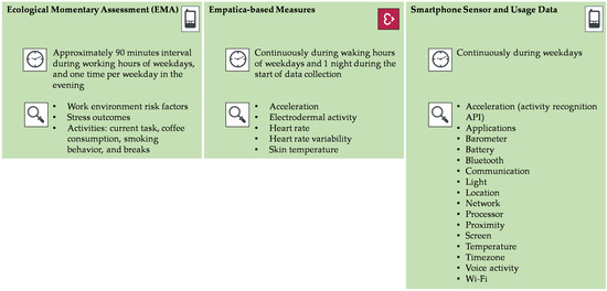 The data collection period consisted of three parts: (1) the EMA via the STRAW app, (2) the physiological data measured with Empatica wristbands, and (3) smartphone sensor and usage data via the STRAW app. An overview of the data collection parts can be found in Figure 2.