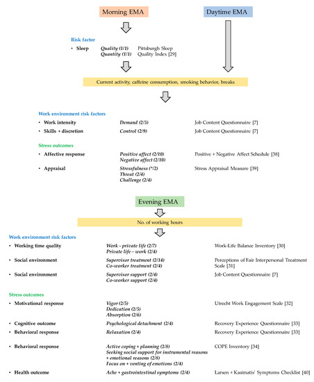 A simplified overview of one day of ecological momentary assessments (EMAs). Column description from left to right: work environment risk factors/stress outcomes, questionnaire subscales, and questionnaires used in EMA. Numbers in brackets: number of items per EMA/total number of items in the questionnaire subscale.