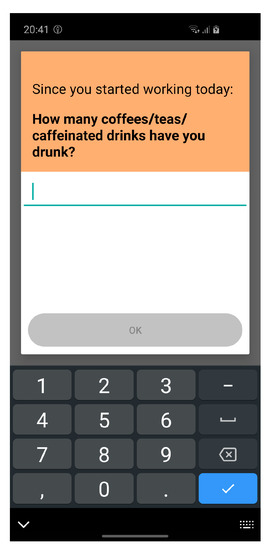 Response options were based on the original questionnaires and adapted to make them suitable to be answered several times per day. These response options are mostly Likert scales (e.g., “Since the last questionnaire: my job allowed me to make a lot of decisions on my own”, answered on a 4-point Likert scale ranging from “I strongly disagree” (0) to “I strongly agree” (3)) and binary answer scales (yes/no). The work activities were selected from a pre-defined list, and only a few questions were answered by using numbers in open-response format (example shown in Figure 4).