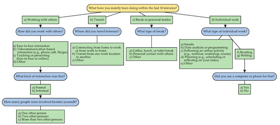 In addition to the work environment risk factors and stress outcomes, health-related behaviors, which are well known to have an impact on physiological stress responses, such as caffeine consumption, smoking, and breaks from work (especially when breaks include physical activity), were included in the EMA. Questions about health-related behaviors were personalized during the briefing, for instance non-smoking participants were not asked about smoking behavior. Additionally, the participants registered their total working hours of that day at the beginning of the evening EMA. Furthermore, participants were asked about the activity they were currently involved in, providing information about possible work environment risk factors and/or information about their current work environment. We developed this activities scheme to be suitable for employees in academic settings and confirmed its structure and completeness with literature [26]. A flowchart of the activity-related questions can be found in Figure 5.