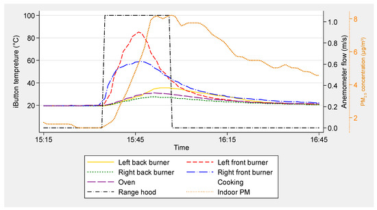 Example data from an event are shown in Figure 1. Temperatures were measured adjacent to four cooktop burners and the oven under the cooktop. Range hood operation was monitored by an anemometer and indoor PM2.5 was measured in the living room. Two cooktop burners were used in this event. The right front burner was started at 15:32 and stopped on or before 15:47 and the left front burner was started at 15:34 and stopped on or before 15:46. Much smaller temperature rises recorded by sensors at the oven and other two cooktop burners are assumed to result from the two front burners. Range hood use was determined to start at 15:35 and end at 15:57 based on the measured anemometer flow rate. Because the delay between range hood start and cooking start was less than 3 min and the range hood was used through the rest of the cooking event, it was considered as a cooking event with full range hood use.