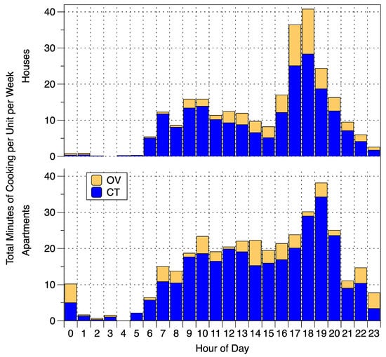 Distribution of total minutes of cooktop (CT) and oven (OV) use per home per week at each hour of the day in houses and apartments.