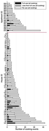Figure 3 shows the number of cooking events with no range hood use, any use, and full use in each house or apartment. On average, occupants in the apartments cooked slightly more meals (median = 9.0, mean = 12.4) than occupants in the houses (median = 7.5, mean = 10.6) during the weeklong monitoring period. About one-third (32%) of hood uses were considered full use, the remaining two-thirds of hood uses started with delays longer than 3 min and/or did not span 80% of the total cooking duration (see Tables S1 and S2 for more details). Of the 37 houses and 16 apartments with five or more cooking events, 49% of houses and 63% of apartments used the range hood for less than 30% of cooking events and only two of each type used the range hood during more than 70% of cooking events. The mean rate was indistinguishable in houses and apartments.