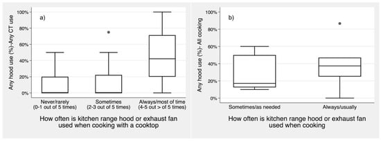 Distribution of range hood use in each home grouped by survey responses for (a) houses (any CT) and (b) apartments (all cooking types). Boxes show interquartile range (IQR), whiskers are limit values within 75th + 1.5IQR and 25th − 1.5IQR, and circles show all data outside of whiskers.
