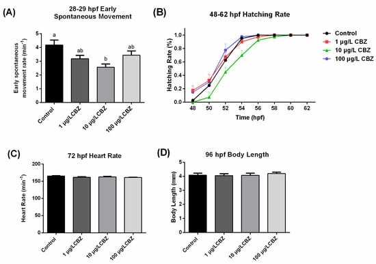 Carbamazepine (CBZ) effects on the development of zebrafish larvae after 6 d exposure (mean ± SEM). (A) Early spontaneous movement rate at 28–29 hpf (n = 16); (B) Hatching rate at 48–62 hpf (n = 50); (C) Heart rate at 72 hpf (n = 12); (D) Body length at 96 hpf (n = 10). Bars with different letters indicate significant differences between each other (p < 0.05).
