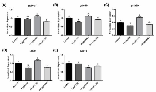 The steady state mRNA levels of (A) gabra1, (B) grin1b, (C) gria2b, (D) abat, (E) gad1b in zebrafish larvae following exposure to CBZ for 6 d (mean ± SEM). Bars with different letters indicate significant differences between each other (n = 5; p < 0.05).