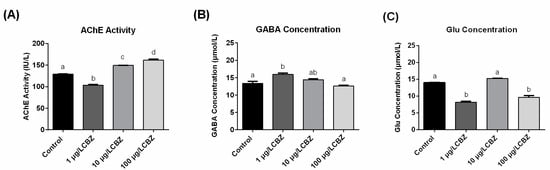 The acetylcholine (AchE) activity, gamma-aminobutyric acid (GABA) and glutamate (Glu) concentrations in the zebrafish larvae after 6 d of exposure to CBZ (mean ± SEM). (A) Acetylcholine activity; (B) Gamma-aminobutyric acid concentration; (C) Glutamate concentration. Bars with different letters indicate significant differences among groups (n = 3; p < 0.05).