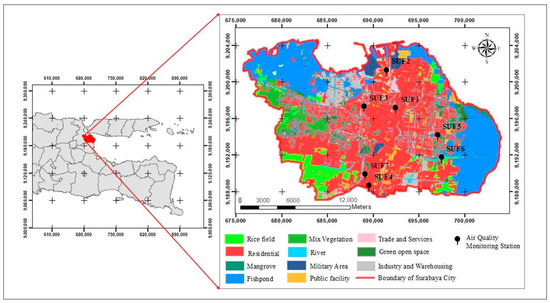 Surabaya City (7°21′ S, 112°54′ E), the second largest city in Indonesia, was chosen as the study area. The size of Surabaya City is about 326.36 km2, which is divided into 31 districts and 154 villages. The northern and eastern portions of the city are surrounded by Madura Bay, while neighboring Sidoarjo County is in the southern portion and Gresik County is in the western portion. The population density is 8463 people/km2 [33]. Figure 1 illustrates most of Surabaya City was residential areas in 2014 [34]. Surabaya fixed station (SUF) 1, 4, and 7 are in rural areas, SUF 2 and 3 are in proximity to industrial areas, and SUF 5 and 6 are in urban areas. The development and establishment of road networks has helped residents in the region to more easily travel from one portion to another [35]. The population in Surabaya has increased each year, and air pollution due to transportation and industrial activity, too, have increased. The transportation sector contributes nearly 60% of pollutants, and, specifically, are responsible for 25% of the carbon dioxide (CO2), 90% of the carbon monoxide (CO), and 50% of the nitrogen oxide (NOx) present. In 2016 there were 2,244,317 units of gasoline-fueled vehicles and 150,413 units of diesel-fueled vehicles [36]. This number of vehicles will act to increase NO2 and PM10 levels due to motor vehicle fumes and dust agitated from the road [37].