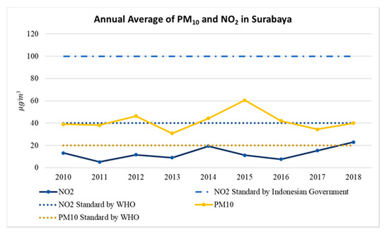 Time-series trend of air pollutants (particulate matter (PM10) and nitrogen dioxide (NO2) concentrations) in Surabaya from 2010 to 2018.
