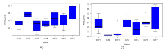 Figure 2 shows the annual trend of PM10 and NO2 concentrations calculated from information collected in all stations from 2010 to 2018 in Surabaya. Regarding PM10, the annual mean concentration of PM10 in Surabaya was 41.31 g/m3, well beyond the 20 μg/m3 limit recommended by WHO [29]. The highest level was observed in 2015 (60.46 μg/m3) and the lowest level was recorded in 2013 (30.85 μg/m3). Meanwhile, the annual mean concentration of NO2 during the study period was 12.86 μg/m3. The highest concentration of NO2 was observed in 2018 (22.91 μg/m3) and the lowest concentration was detected in 2011 (5.2 μg/m3) (Figure 2). Overall, the annual level of NO2 did not change significantly during the 9-year period and did not exceed the 40 μg/m3 limit recommended by WHO or the 100 μg/m3 limit recommended by the Indonesian government. Figure 3 illustrates the boxplots of PM10 and NO2 concentrations at the seven monitoring stations. The highest concentrations of PM10 and NO2 were both observed in SUF7 (64.77 ± 19.72 μg/m3 for PM10 and 19.24 ± 13.49 μg/m3 for NO2) and the lowest concentration was recorded in SUF3 (27.502 ± 18.095 μg/m3 for PM10 and 5.021 ± 6.782 μg/m3 for NO2).