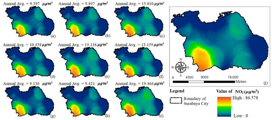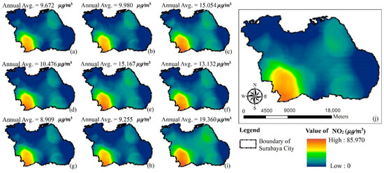 Prediction maps of NO2 concentration variations using GWR model: (a) 2010 (b) 2011 (c) 2012 (d) 2013 (e) 2014 (f) 2015 (g) 2016 (h) 2017 (i) 2018 (j) average from 2010 to 2018.