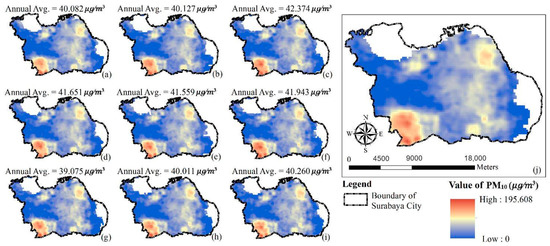Prediction maps of PM10 concentration variations using GWR model: (a) 2010 (b) 2011 (c) 2012 (d) 2013 (e) 2014 (f) 2015 (g) 2016 (h) 2017 (i) 2018 (j) average from 2010 to 2018.