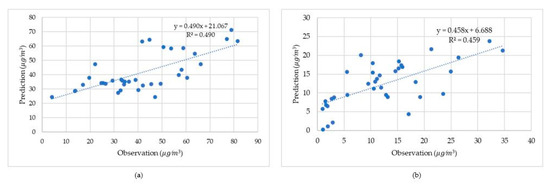 Verification using GTWR based on observations regressed against predictions. (a) PM10 (b) NO2.