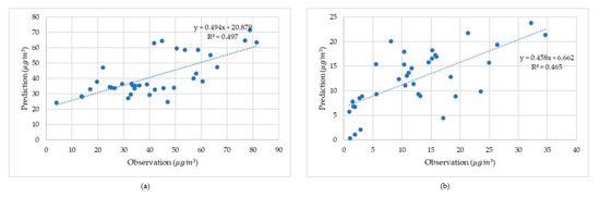 Figure 8 displays the comparison using the GWR method between model predictions and on-site observations. The R2 was 0.49 for PM10 and 0.459 for NO2, with p values less than 0.05, confirming the robustness of established models.