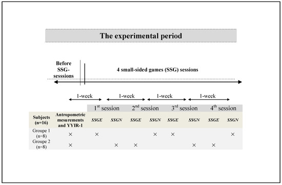 This study followed a cross-sectional design. The research was conducted during the 2019–2020 scholar mid-season (eight weeks after the beginning of the season). Before the beginning of the experimental sessions, anthropometric characteristics were assessed, and the students performed the Yo-Yo intermittent recovery test level1 (YYIR-1) to estimate the maximum heart rate (HRmax) [22]. Four sessions of 4-a-side SSG were performed on separate days, each separated by a one-week interval. Each testing protocol (SSG with the physical education teacher’s verbal encouragement (SSGN) and SSG without verbal encouragement (SSGNE)) was repeated twice. During each experimental session, the participants were split into two groups with eight subjects performing SSGE and the other eight performing SSGNE in randomized order. In total, each student performed the SSGE twice, and the SSGNE twice (Figure 1). All measurements were taken on the same synthetic pitch grass at the same time of the day (between 9:00 and 10:30 a.m.) to limit the effects of circadian variations on the measured variables.