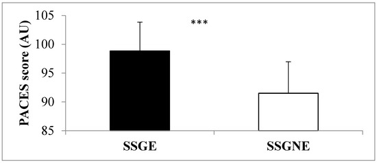 The physical enjoyment score was significantly higher (p < 0.001, ES = 1.45) in SSGE compared to SSGNE (Figure 2).