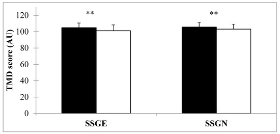 Mean profile of mood states (POMS) score (AU) for both small-sided games training (SSGE) and (SSGNE) collected before (pre-training) and after (post-training) each session. TMD: total mood disturbance. ** p < 0.01.