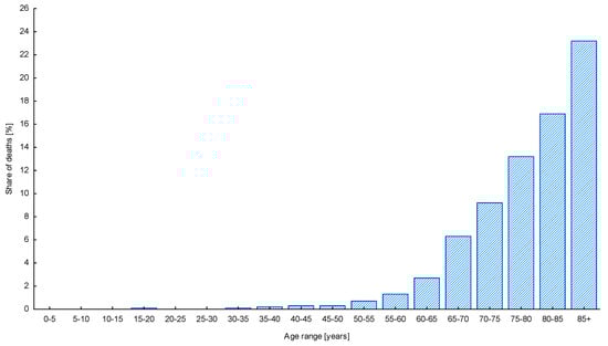 The research of Polish Central Statistical Office [5] that was conducted prior to the pandemic, and was attended by 13.3 thousand people over 65 years of age, showed that as many as 67% of them used to spend their free time outdoors, e.g., walking and spending time outside the household, at least once a month. Nevertheless, the medical experts say that it is the oldest population that is most at risk of infection of COVID-19 [49,50]; thus, many seniors made the decision to self-isolate. In many European countries, including Poland, the governments advised seniors to stay at homes, in order to protect this vulnerable social group. The high risk the infection of COVID-19 may bring to the older citizens is confirmed by the data on the mortality due to COVID-19 with the regard to the age group (Figure 1).