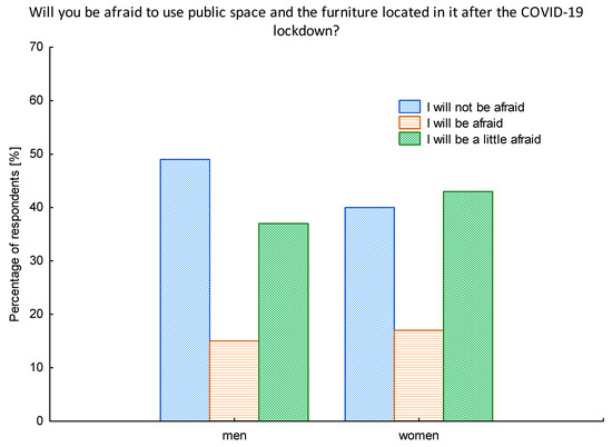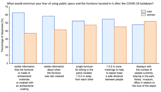 Taking into consideration the gender factor indicated that over 60% of men would like to see the information that the furniture in public spaces is made of antibacterial materials or is covered with an antibacterial coating, while 59% would like to see visible information about the timetable of the cleaning activities in a given space (Figure 9). Women, in turn, were the most enthusiastic about the idea of screens indicating the number of people currently using the park, the library, the museum, or the office, etc. in relation to the size of the object, as well as a new designs of furniture for sitting for one person located in the parks with the distance of 1.5–2 m from each other, to facilitate the physical but not social distancing.