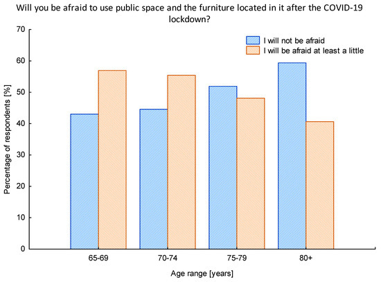 An interesting result was obtained from the analysis of the attitudes toward using of the public space in relation to the age of respondents. According to the medical data (Figure 1), the higher the age, the bigger the possibility of having a severe course of the disease, including the death of the patient. Thus, we expected a strong positive correlation between the age of respondents and the number of people experiencing the fear of using the public space after the lockdown. It turned out, however, that the correlation between those variables was a negative one, meaning that the older the people were, the lower the number of them who were afraid of using the public space (Figure 3). Seniors’ fear of using public space and the furniture located in it decreased with the age of seniors. In this case, the relationship between the age of seniors and the percentage of people who are afraid to use public spaces can be described by the linear function (y = −1.240 × x − 142.03) with a high correlation coefficient (r = −0.944).