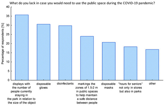 Even during the pandemic lockdown, some seniors needed to leave their homes. We investigated what were the things they lacked the most in public spaces in that situation. It is interesting to note that over 35% lacked the information on how crowded the place they wanted to visit is. Thus, they liked the most the idea of seeing screens indicating the number of people currently being present in a park, with reference to the area of the park, in order to feel more safe and make a decision to enter (Figure 6). Respondents indicated also they would like to see disposable gloves and disinfectants being available in public spaces. Among the open answers to this question, respondents mentioned safe public transport with smaller number of users, the general feeling of safety in the public space, adherence to the safety COVID-19 rules by other citizens, and safe and senior-friendly pharmacies. Others pointed out that they try to avoid the public space during the lockdown and use it only when it is necessary.