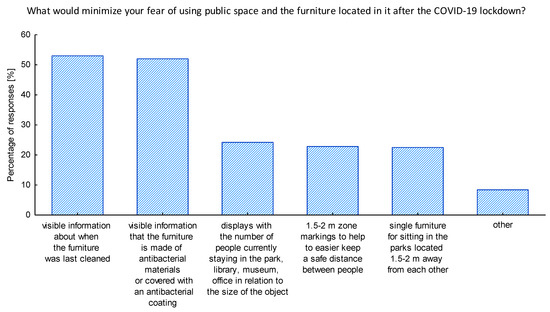 Once the first wave of COVID-19 was gone public institutions started to be re-opened. Nevertheless, the pandemic was still there not allowing for the full return to the previous lifestyle of societies. Thus managers and owners of public spaces needed to adapt quickly to the new conditions and safety requirements, but also to the new customer requests to make their premises safe and attractive again. The world of design has shown its support, and a range of new ideas has appeared. The initiative of The Design Vanguard named Design for COVID-19 is an inspiring example [57]. Moreover, our research has contributed to the recognition of the first emotions and reactions arose due to the first wave of COVID-19 pandemic allowing for the diagnosis of seniors’ preferences. During our research we gathered the opinions of seniors concerning the potential solutions that could be implemented in the public space to raise the level of safety in the times of COVID-19 and thus minimize the fear of using them (Figure 7, Figure 8 and Figure 9). What we have noticed was a raising interest in the hygienic issues and even though the antibacterial materials and covering the furniture with an antibacterial coating will not help to stop the COVID-19 virus, respondents had a feeling that providing any kind of solution for enhancing the hygienic values would make them feel more safe in the public space. This is in line with the approach to include health considerations in the creation of public spaces. Honey-Roses et al. [15] highlight that although this theme is not new, and numerous authors have dedicated their work to support the design of public space with the health issues as a bottom-line [58,59], it has never before been such crucial and such widely discussed and accepted. Moreover, experts worldwide strive to face the challenge of the new COVID-19 pandemic. French material manufacturing company Serge Ferrari Group has developed and patented a coating technology for its membranes which makes its surfaces virucidal [60]. This solution, due to the use of the technology based on silver particles, is capable of eliminating coronaviruses by up to 99.5%. Thus, the company managed to find a way to prevent fabrics from becoming propagation sources for viruses and bacteria. The solution can be applied on handles, railings, furniture, etc. We would like to pay attention to the fact that half of the seniors participating in the research admitted that providing visible information when the furniture or other elements of the public space were cleaned is also a good way to minimize their fear of using the public space in the times of pandemic. Furthermore, respondents pointed out that the cleanness of the furniture located in the public space, even before the pandemic hit, was one of the major issues discouraging them to use the public space.